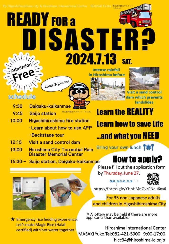 There will be a Disaster Prevention (BOSAI) Festa on July 13 (Sat.) from 9:30 to 15:30. This is a bus tour. Foreign residents of Higashihiroshima City are welcome to participate. It is free of charge. Please see the flyer for details.