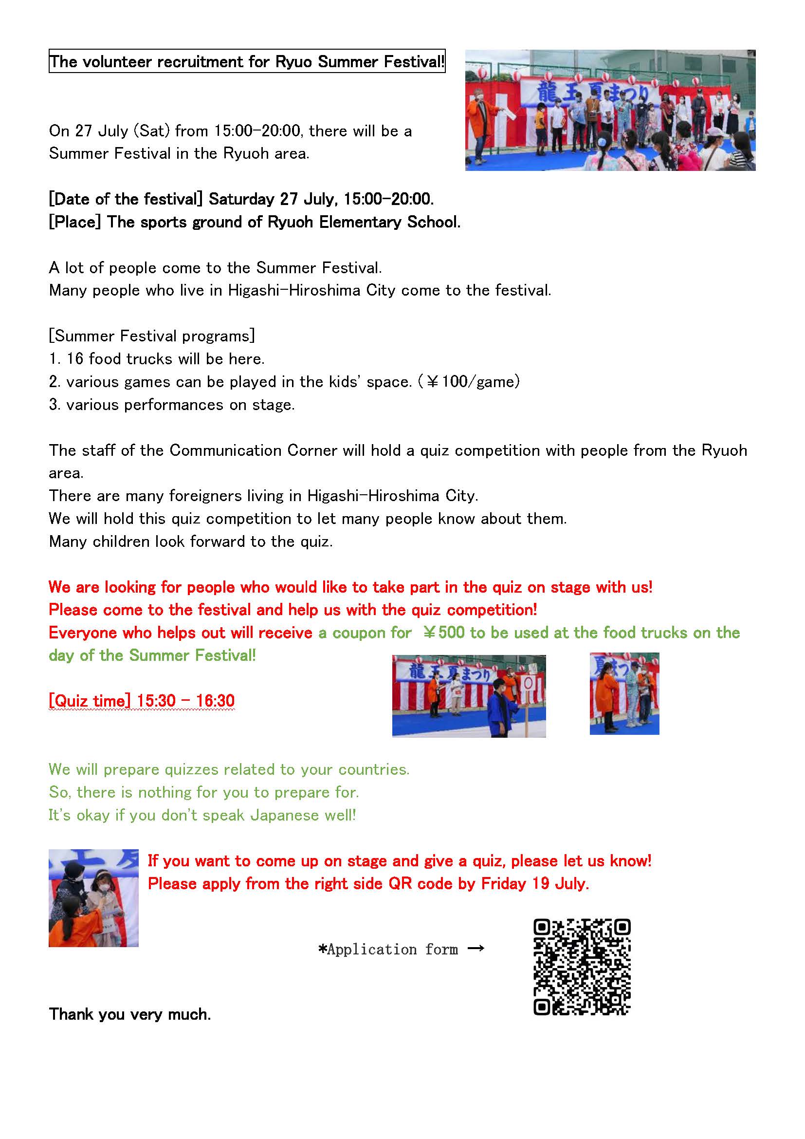 Lễ hội mùa hè Ryuo sẽ diễn ra vào ngày 27 tháng 7 (thứ bảy) tại sân trường tiểu học Ryuo. Tại lễ hội sẽ có phần giao lưu quốc tế. Chúng tôi đang tìm kiếm những người nước ngoài có thể tham gia đọc câu đố trên sân khấu. Những người tham gia sẽ nhận được quà tặng là phiếu mua hàng trị giá 500 yên dùng tại các xe bán đồ ăn vào ngày diễn ra lễ hội. Để biết thêm thông tin chi tiết, vui lòng xem tờ rơi dưới đây. Những người có thể tham gia đọc câu đố, vui lòng đăng ký tại đường link sau đây.