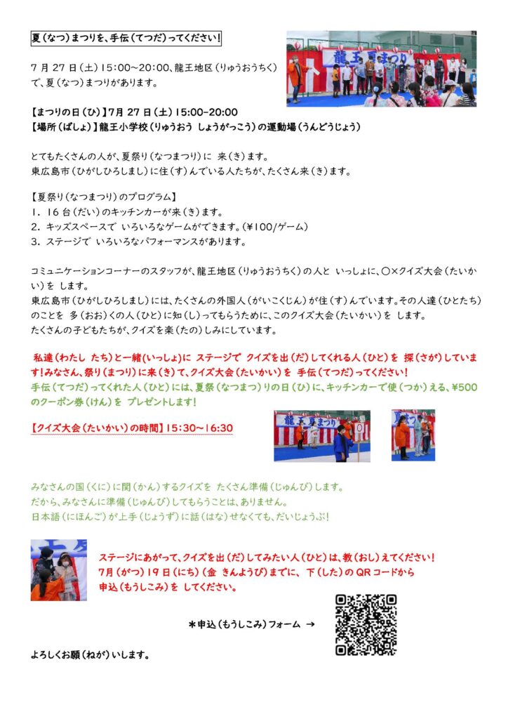 7月27日土曜(どよう) 龍王(りゅうおう)夏(なつ)祭(まつり)です。龍王小学校(りゅうおうしょうがっこう)のグラウンドです。この祭(まつり)の国際交流(こくさいこうりゅう)タイムがあります。この時(とき)ステージで、クイズを出(だ)してくれる外国(がいこく)の人(ひと)を探(さが)しています。手伝(てつだ)ってくれた人(ひと)には、夏祭(なつまつり)の日(ひ)に、キッチンカーで使(つか)える¥500のクーポン券(けん)をプレゼントします。もっと知(し)りたい人(ひと)は、チラシをみてください。手伝(てつだ)ってくれる人(ひと)は、下(した)のURLから 申込(もうしこみ)して ください。