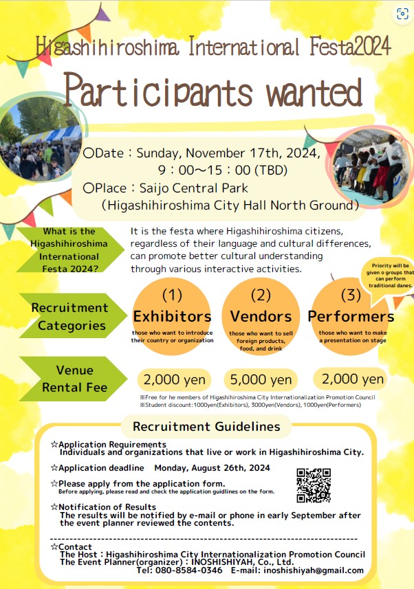 Higashihiroshima City is recruiting participants for the Higashihiroshima International Festa 2024, which will be held on Sunday, November 17th. The deadline is Monday, August 26th. Please apply using the QR code on the flyer or this URL.