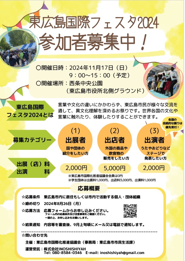 【Recruitment of Exhibitors, Vendors and Performers for Higashihiroshima International Festa 2024】【东广岛国际节 诚邀参与者】[Festa Internacional Higashi Hiroshima, recrutando participantes]【東広島国際(ひがしひろしまこくさい)フェスタ、参加者(さんかしゃ)募集(ぼしゅう)】