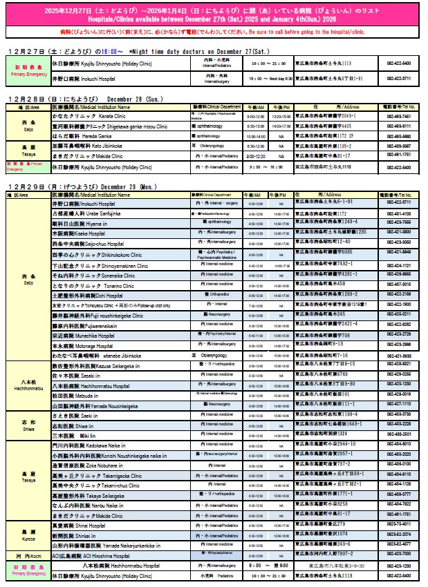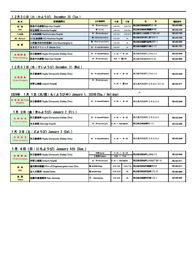 Most hospitals will be closed from December 27th (Saturday) to January 4th (Sunday). This is a list of hospitals that will be open. If you need to go to the hospital, be sure to call before going.