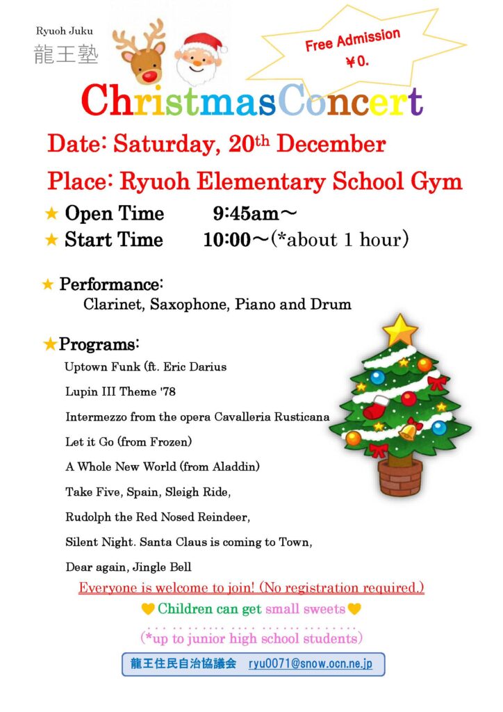 O Concerto de Natal da Escola Ryuo será realizado no dia 20 de dezembro (sábado), a partir das 10h00. O evento acontecerá no ginásio da Escola Primária Ryuo. Serão apresentadas músicas natalinas com clarinete, saxofone, piano e bateria. A entrada é gratuita (0 ienes). Não é necessário fazer inscrição.