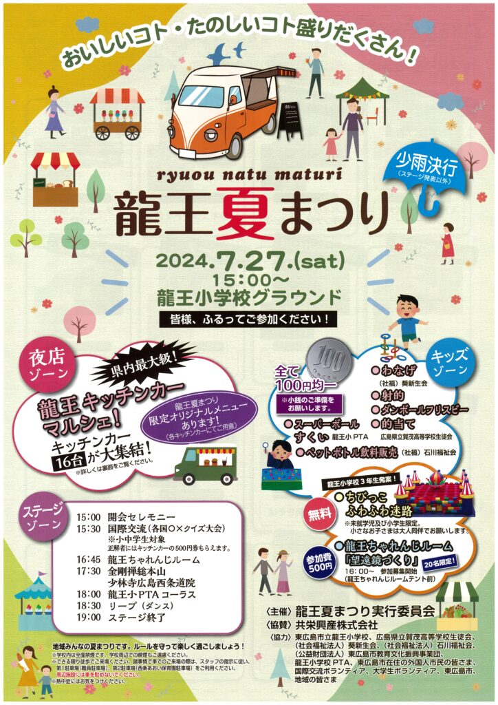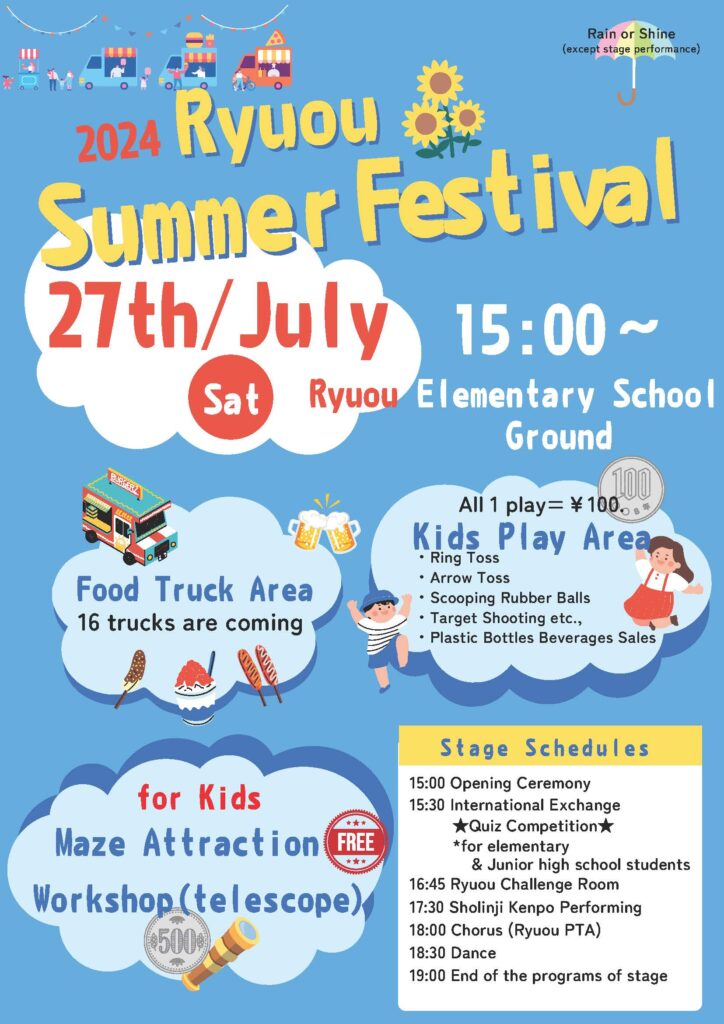 The Ryuo Summer Festival will be held at the Ryuo Elementary School grounds on Saturday, July 27, from 3:00 pm. There will be various stage performances, a 100 yen play corner, and 16 kitchen cars. Everyone is welcome to participate. Please see the flyer for details.