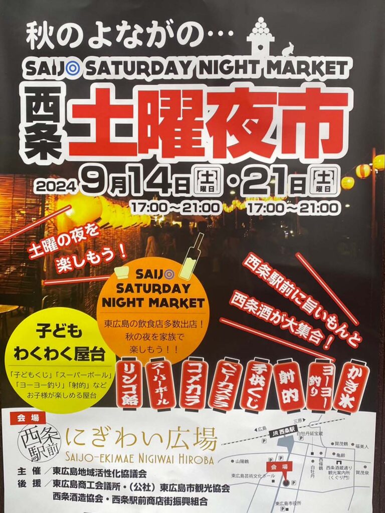 Ngày 14/9 (Thứ Bảy), 21/9 (Thứ Bảy), từ 17:00-21:00, tại quảng trường Nigiwai trước ga Saijo sẽ tổ chức sự kiện Chợ đêm Thứ Bảy. Có nhiều quầy hàng dành riêng cho cả trẻ em và người lớn. Về thông tin chi tiết, xin vui lòng tham khảo qua link và tờ rơi dưới.