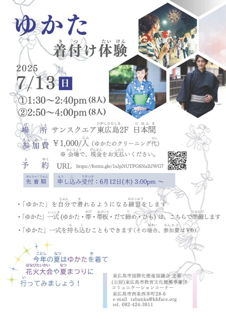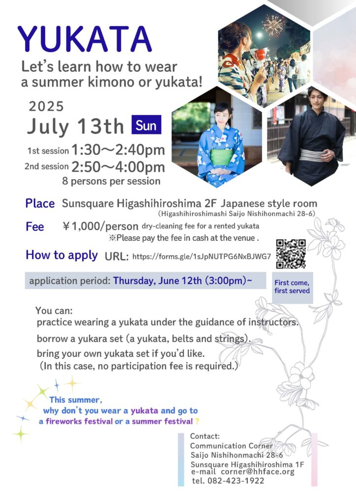 Vào buổi chiều ngày 13/7 (Chủ Nhật) sẽ diễn ra sự kiện học cách mặc Yukata. Bạn có thể mang theo Yukata của mình hoặc mượn Yukata tại sự kiện. Sau khi mặc Yukata, sẽ có thời gian để chụp ảnh. Những người từ 15 tuổi trở lên có thể tham gia. Phí tham gia là 1000 yên.