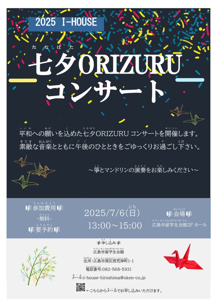 No dia 6 de julho (domingo), das 13h às 15h, haverá um concerto denominado Tanabata ORIZURU no 2º andar do Salão Internacional de Estudantes da Cidade de Hiroshima (Ryugakusei Kaikan).