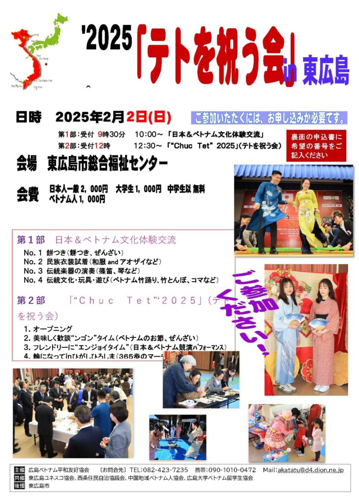 2月2日(日にちようび)9:30~16:00、 総合福祉(そうごうふくし)センターで 「テトを祝(いわ)う会(かい)」が あります。参加(さんか)するには 申込(もうしこみ)が 必要(ひつよう)です。もっと知(し)りたい人(ひと)、申込(もうしこ)みたい人(ひと)は 次(つぎ)の URLを クリックしてください。