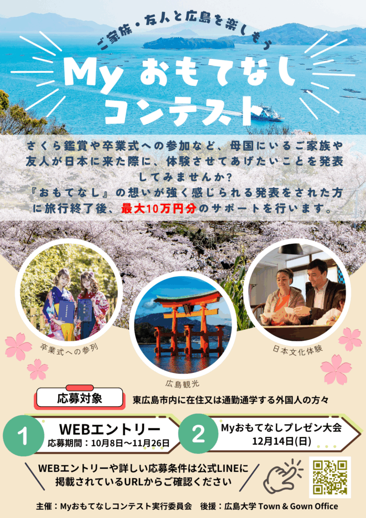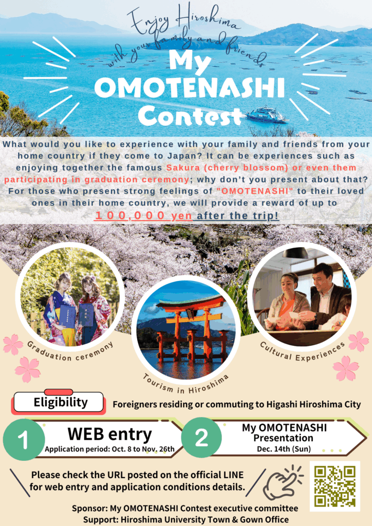 O Town and Gown Office (TGO), a Universidade de Hiroshima e o Discover Higashihiroshima estão organizando este concurso em conjunto. Qualquer pessoa que fizer uma apresentação que demonstre um forte senso de "omotenashi" (hospitalidade) para as pessoas importantes em seu país de origem receberá um apoio de até 100.000 ienes após a viagem!