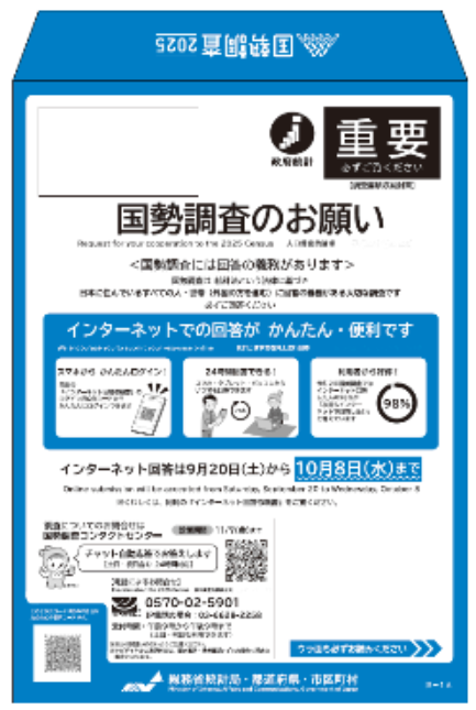 Cuộc điều tra dân số sẽ được tiến hành từ ngày 1/10/2025. Đây là cuộc điều tra quan trọng được quy định trong pháp luật. Tất cả người, hộ gia đình đang sinh sống tại Nhật Bản đều thuộc đối tượng của cuộc điều tra này. Do vậy các cư dân nước ngoài cũng hãy gửi câu trả lời.
