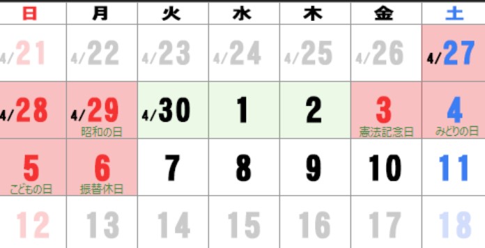 Nhật Bản sẽ bước vào kỳ nghỉ lễ dài có tên gọi là Tuần lễ Vàng (Golden week) từ ngày 27/4 (Thứ Bảy) đến ngày 6/5 (Thứ Hai). Ngày lễ là ngày 29/4 (Ngày Showa), 3/5 (Ngày Kỷ niệm Hiến pháp), 4/5 (Ngày Xanh), 5/5 (Ngày thiếu nhi), 6/5 (mùng 5 vào chủ Nhật nên sẽ được nghỉ thêm mùng 6).