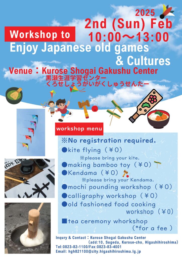 On Sunday, 2nd February, 2025, from 10:00 to 13:00, there will be a workshop at Kurose Shogai Gakushu Center 'Workshop to enjoy Japanese old games and Culture. You don't have to apply. For more details, please see the attached flyer.
