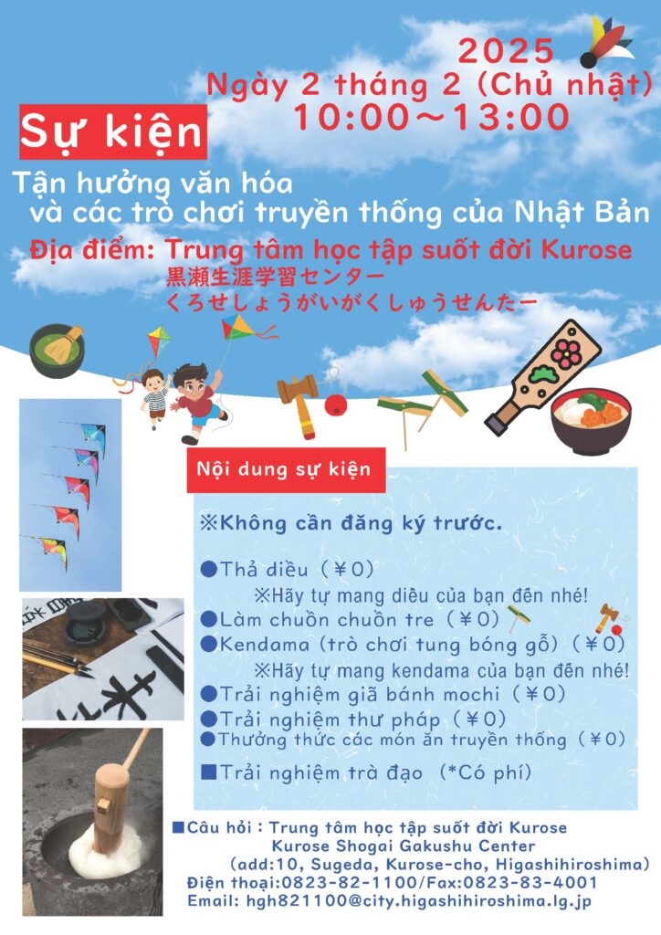 Ngày 2/2/2025 (Chủ Nhật), từ 10:00-13:00, tại Trung tâm học tập suốt đời Kurose sẽ diễn ra buổi workshop trải nghiệm văn hóa và trò chơi truyền thống của Nhật Bản. Không cần đăng ký trước để tham gia sự kiện này. Tham khảo thêm thông tin chi tiết trong tờ rơi dưới.