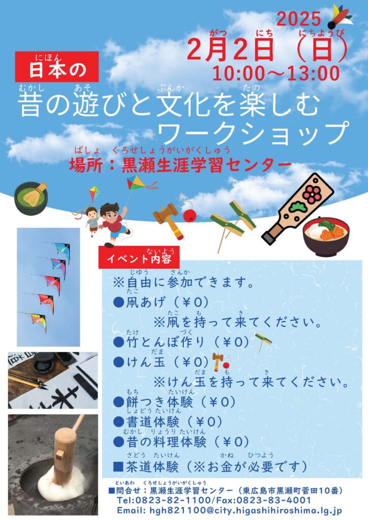 2025年2月2日(日曜/にちようび)、10:00~13:00、黒瀬生涯学習(くろせしょうがいがくしゅう)センターで、日本(にほん)の 昔(むかし)の 遊(あそ)びと 文化(ぶんか)を 楽(たの)しむ ワークショップが あります。申込(もうしこみ)を しなくても 大丈夫(だいじょうぶ)です。もっと 知(し)りたい人(ひと)は、チラシを みてください。