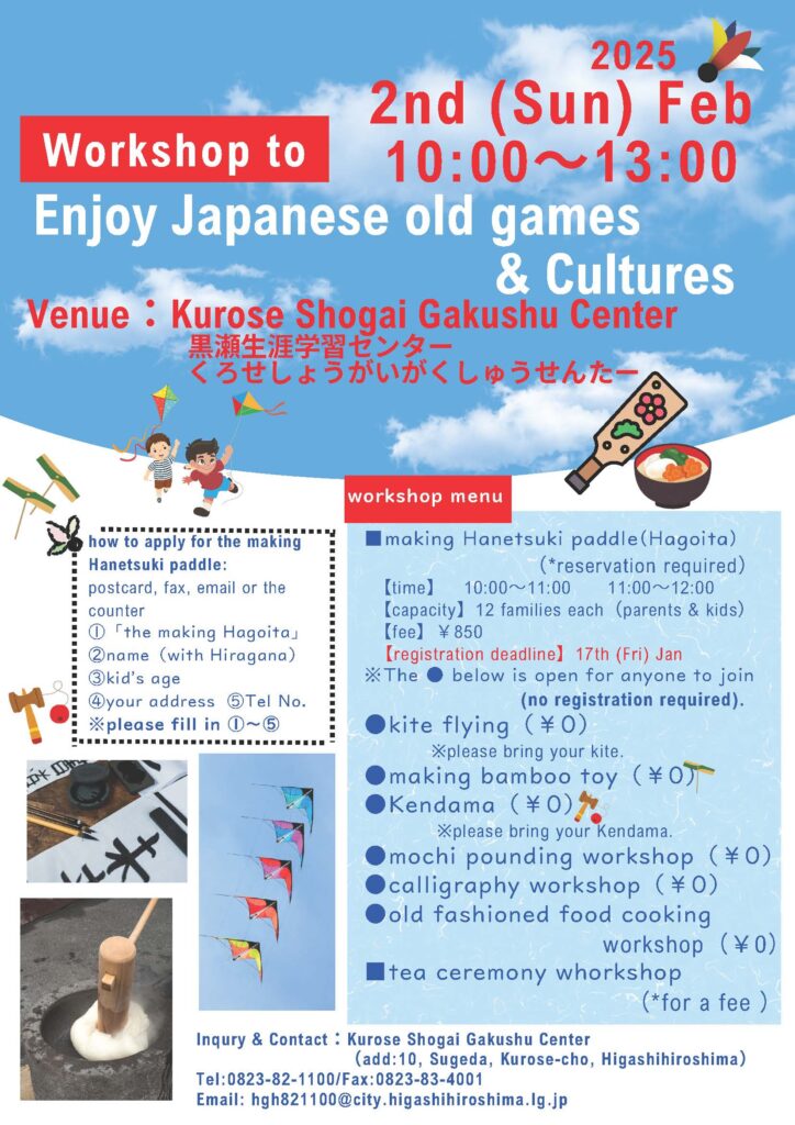 2025年2月2日(日曜/にちようび)、10:00~13:00、黒瀬生涯学習(くろせしょうがいがくしゅう)センターで、日本(にほん)の 昔(むかし)の 遊(あそ)びと 文化(ぶんか)を 楽(たの)しむ ワークショップが あります。申込(もうしこみ)を しなくても 大丈夫(だいじょうぶ)です。でも、羽子板(はごいた)作(つく)りが したい人(ひと)だけは、申込(もうしこみ)を してください。もっと 知(し)りたい人(ひと)は、チラシを みてください。