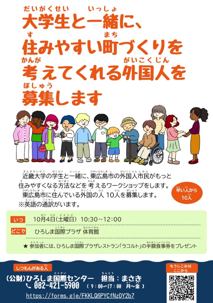 10月4日(土どようび)10:30~12:00、外国人(がいこくじん)が 住(す)みやすい 東広島市(ひがしひろしまし)にするための 意見(いけん)を 考(かんが)えるワークショップが あります。日本(にほん)の 大学生(だいがくせい)と 一緒(いっしょ)に 考(かんが)えます。東広島市(ひがしひろしまし)に 住(す)んでいる外国人(がいこくじん)が 参加(さんか)できます。英語(えいご)の通訳(つうやく)が います。参加(さんか)したい人(ひと)は チラシのQRコードから 申込(もうしこ)んでください。