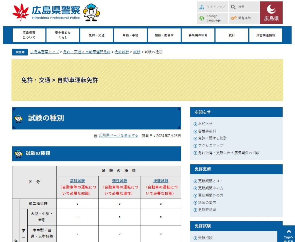 Bắt đầu từ ngày 29 tháng 7, bạn có thể dự thi bằng lái xe bằng 20 thứ tiếng khác nhau. Các loại kỳ thi gồm có bằng lái xe tạm thời, bằng lái xe loại 1 và bằng lái xe loại 2. Để biết thêm thông tin chi tiết, vui lòng xem tại đây: https://www.pref.hiroshima.lg.jp/site/police1/061-u-jyuken-309sikensyubetu.html
