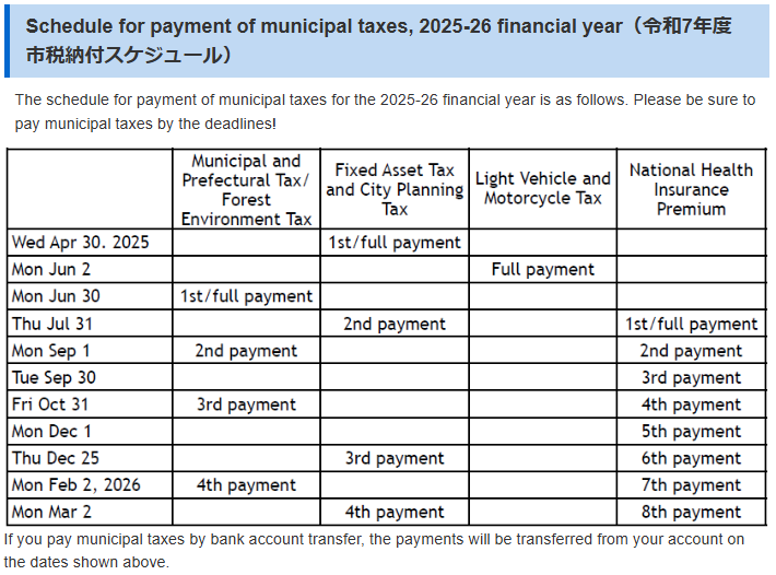 It is thanks to each citizen paying taxes on time that we are able to provide administrative services such as welfare, education, roads, disaster response, and waste disposal. If you miss the due date for payment of taxes, you may be charged a late fee. Please pay your taxes before the deadline to avoid any future issues.