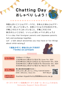 There are chatting days. Foreigners and Japanese can get together and talk about child- raising. English trans […]