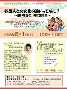 6月1日(土)10:00~11:30、安芸津生涯学習センターで開催される「外国人市民との関わり方」について考える講座です。日本人対象です。