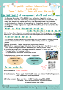 【Recruitment of staff and volunteers for International Festa 2024】【2024东广岛国际节志愿者招募】【Recrutamento de voluntários para Festa Internacional Higashihiroshima 2024】【Tuyển nhân viên và tình nguyện viên cho Lễ hội quốc tế Higashihiroshima 2024】【東広島国際(ひがしひろしまこくさい)フェスタ 2024 ボランティア・スタッフ募集(ぼしゅう)】