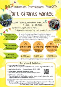 【Recruitment of Exhibitors, Vendors and Performers for Higashihiroshima International Festa 2024】【东广岛国际节 诚邀参与者】[Festa Internacional Higashi Hiroshima, recrutando participantes]【東広島国際(ひがしひろしまこくさい)フェスタ、参加者(さんかしゃ)募集(ぼしゅう)】
