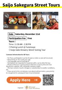 Discover East Hiroshima is looking for participants for a Saijo Sake Brewery Street TourDate & Time: Satur […]