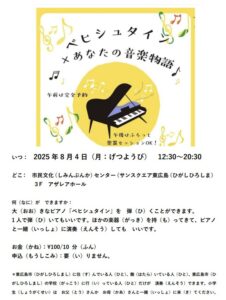 On August 4th (Mon.), from 12:30 to 20:30, you can play the grand piano (Bechstein) at Azalea Hall on the 3rd […]
