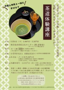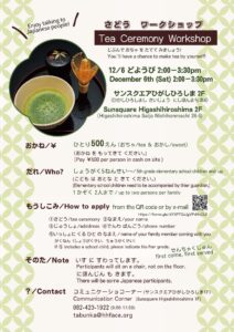 A Japanese Tea Ceremony Workshop will be held at Sunsquare Higashihiroshima on Saturday, December 6th at 2:00 […]