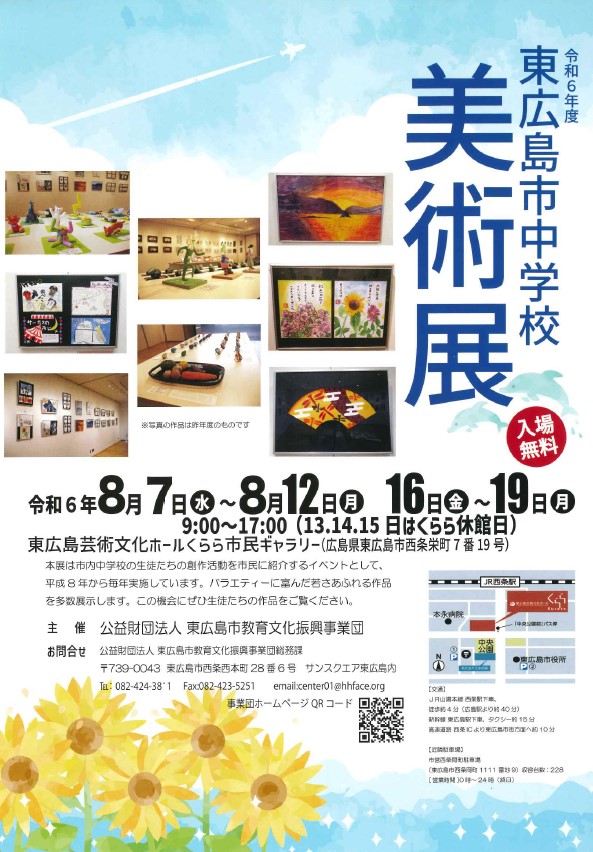 Từ ngày 7 tháng 8 (thứ tư) đến ngày 12 tháng 8 (thứ hai), và từ ngày 16 tháng 8 (thứ sáu) đến ngày 19 tháng 8 (thứ hai), có thể xem các tác phẩm nghệ thuật của học sinh trung học cơ sở tại Phòng triển lãm thị dân ở tầng 1 Kurara. Triển lãm miễn phí và mở cửa từ 9:00 đến 17:00. Để biết thêm thông tin chi tiết, vui lòng xem tờ rơi.