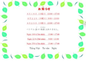 On August 13th, 14th, 15th, there will be no foreign- language consultation services available. However, you c […]