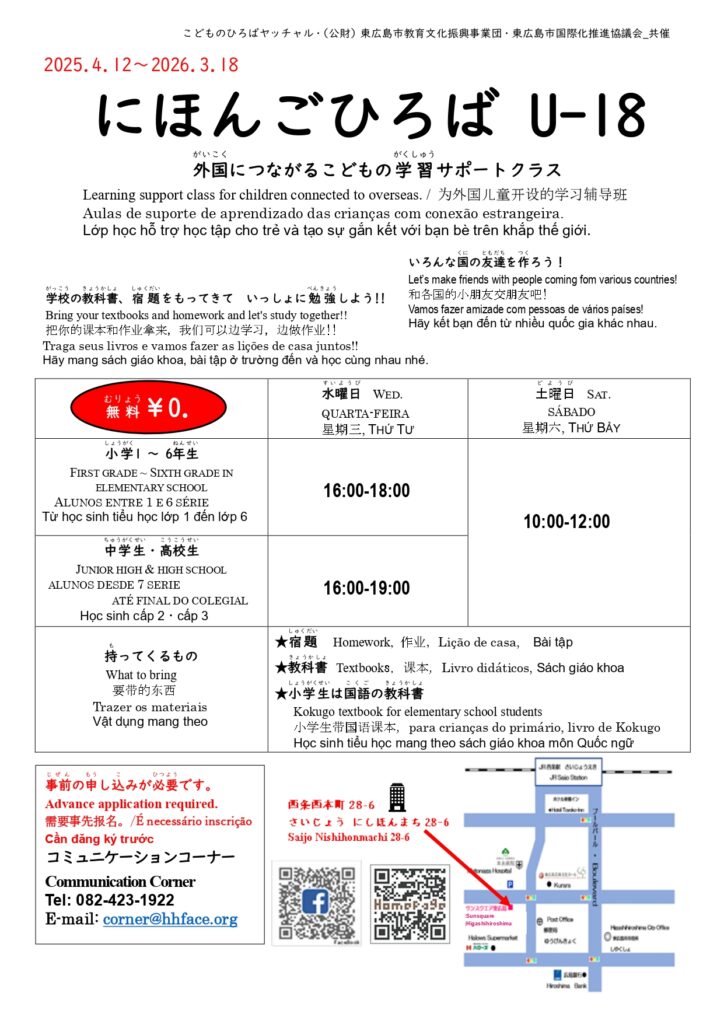 外国(がいこく)につながる子(こ)どもたち(6~18才(さい))が勉強(べんきょう)を します。お金(かね)は いりません。教室(きょうしつ)に 行(い)く前(まえ)に、コミュニケーションコーナーで 申し込んで(もうしこんで)ください。