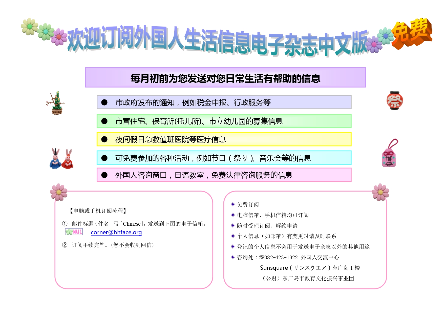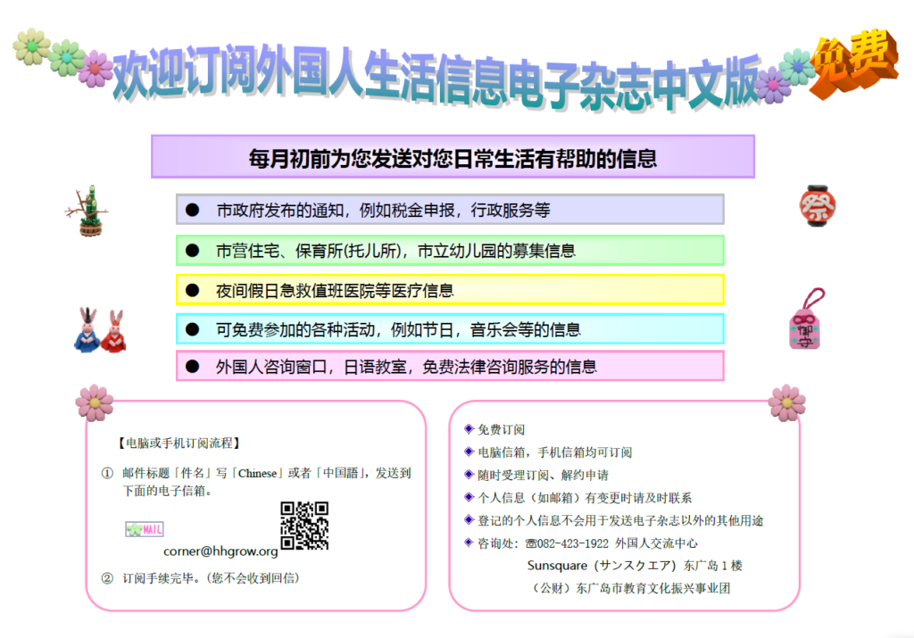 ・每个月我们会以邮件的方式为您发送《东广岛多语言广报》(英文、中文、越南语)的服务。