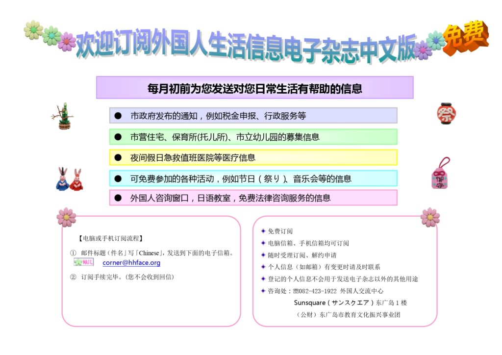 外国人交流中心为各国朋友提供实用资讯,帮助大家更好地适应和享受在东广岛的生活。欢迎随时前来咨询!