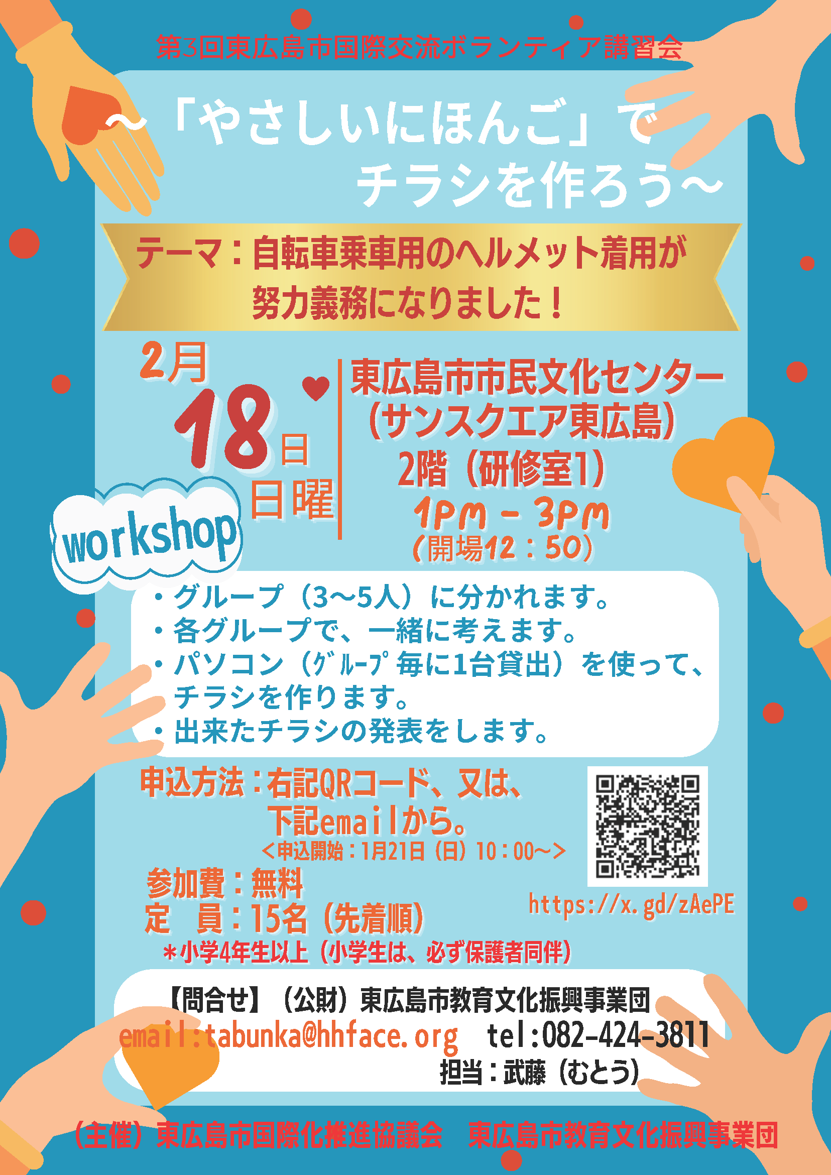 2月(がつ)18日(にち)(日にちようび)13:00~15:00、第(だい)3回(かい)国際交流(こくさいこうりゅう)ボランティア講習会(こうしゅうかい)、~「やさしいにほんご」でチラシを作(つく)ろう~をします。グループワークのワークショップです。「やさしいにほんご」でチラシを作(つく)ります。申込(もうしこみ)は、1月(がつ)21日(にち)(日にちようび)AM10:00~です。もっと知(し)りたい人(ひと)は、チラシを見(み)てください。