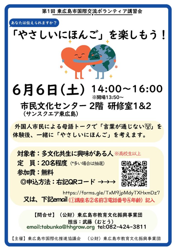 kokusaika 2026年4月11日 【第一回 国際交流ボランティア講習会~「やさしいにほんご」を楽しもう!~】 外国人市民による母語トークで言葉が通じない状況を体験した後、「やさしいにほんご」について一緒に楽しく考えます。_11042026 【第一回 国際交流ボランティア講習会~「やさしいにほんご」を楽しもう!~】 はコメントを受け付けていません Inイベント情報 お知らせ