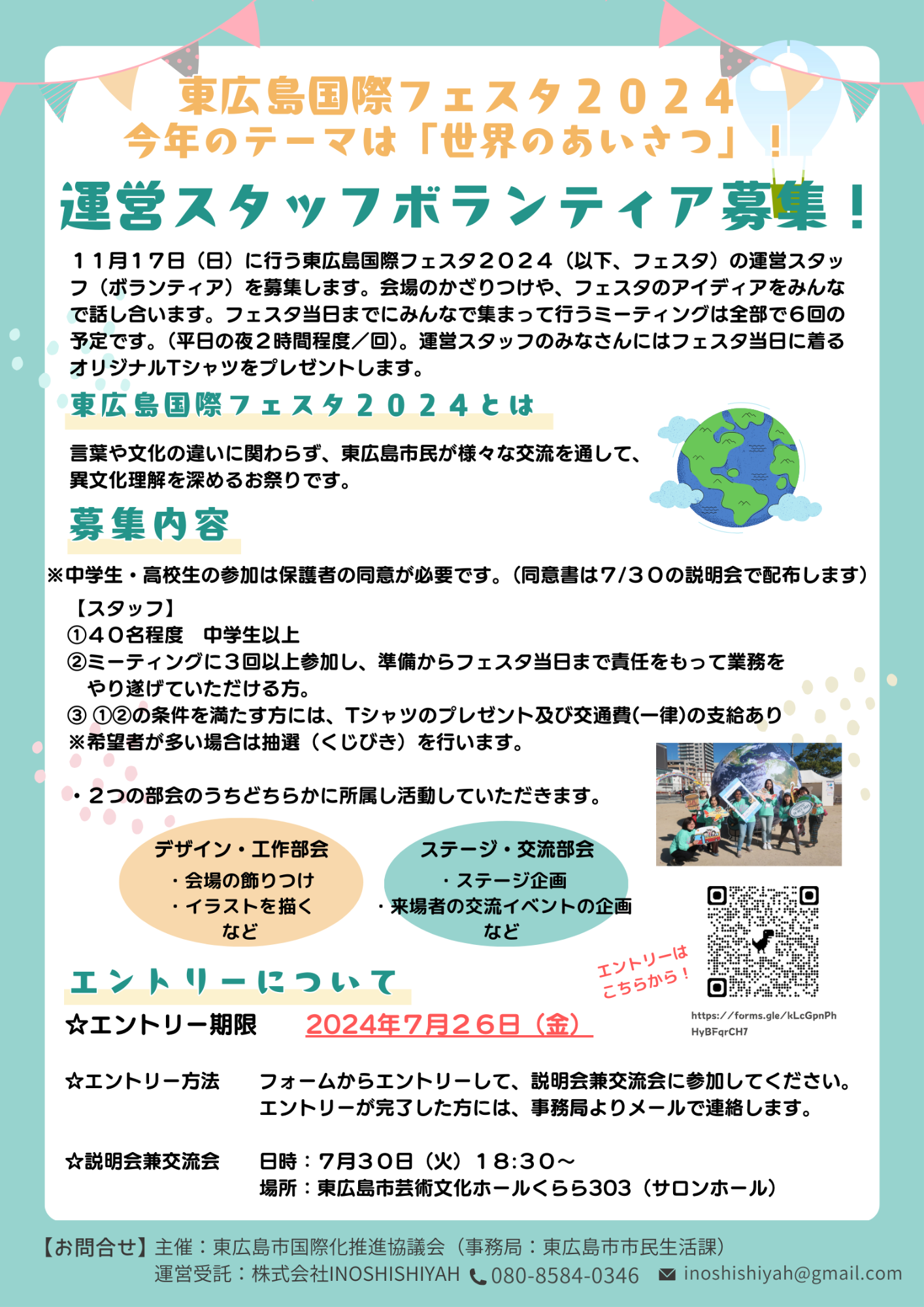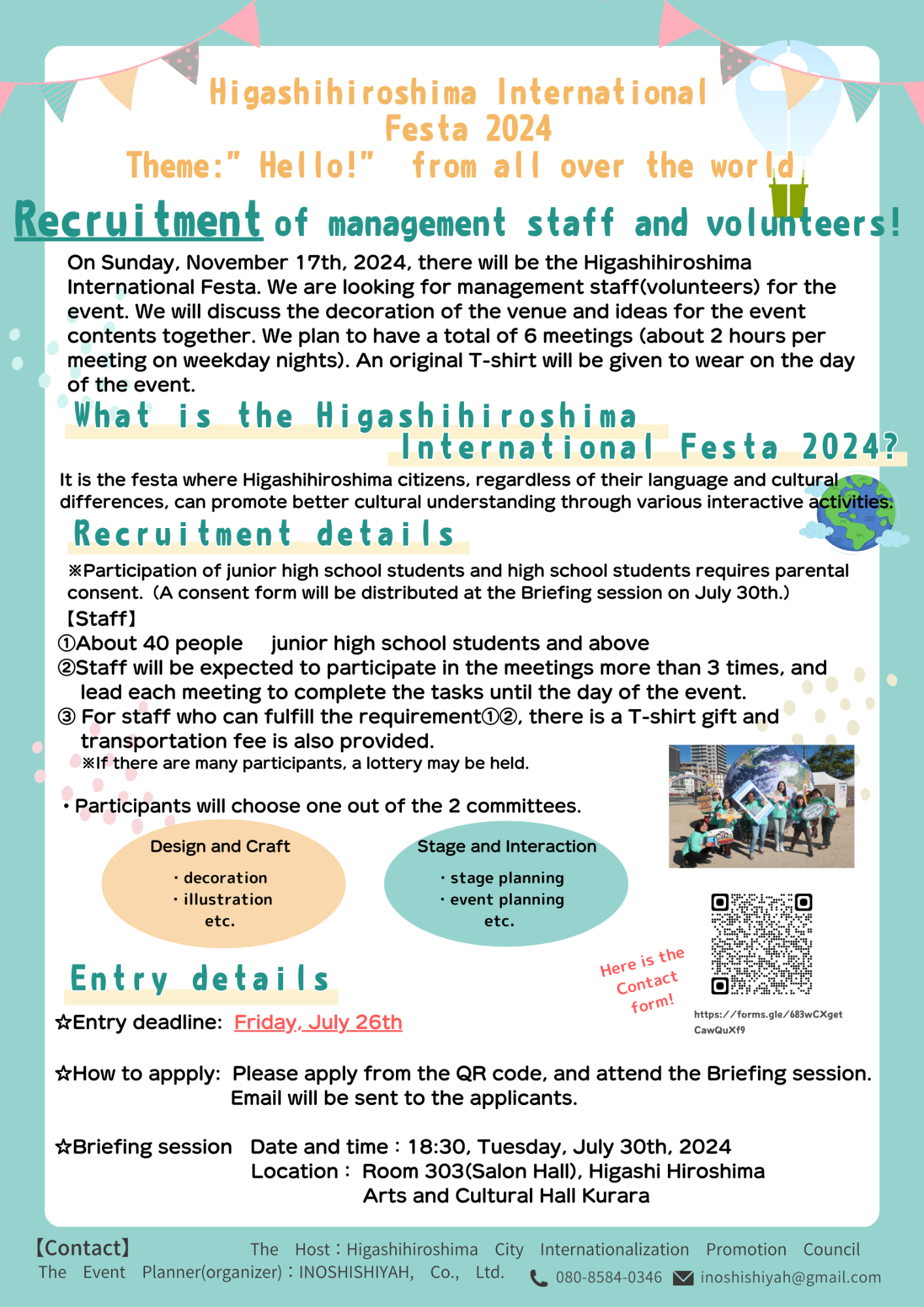 Volunteer staff for Higashihiroshima International Festa 2024 is being recruited. You will discuss decorating the venue and ideas for the Festa together. About 6 meetings are going to be held. (about 2 hours per meeting on weekday evenings). All volunteers and staff will receive an original T-shirt to wear on the day of the Festa. For those who want to know more, please see the flyer.