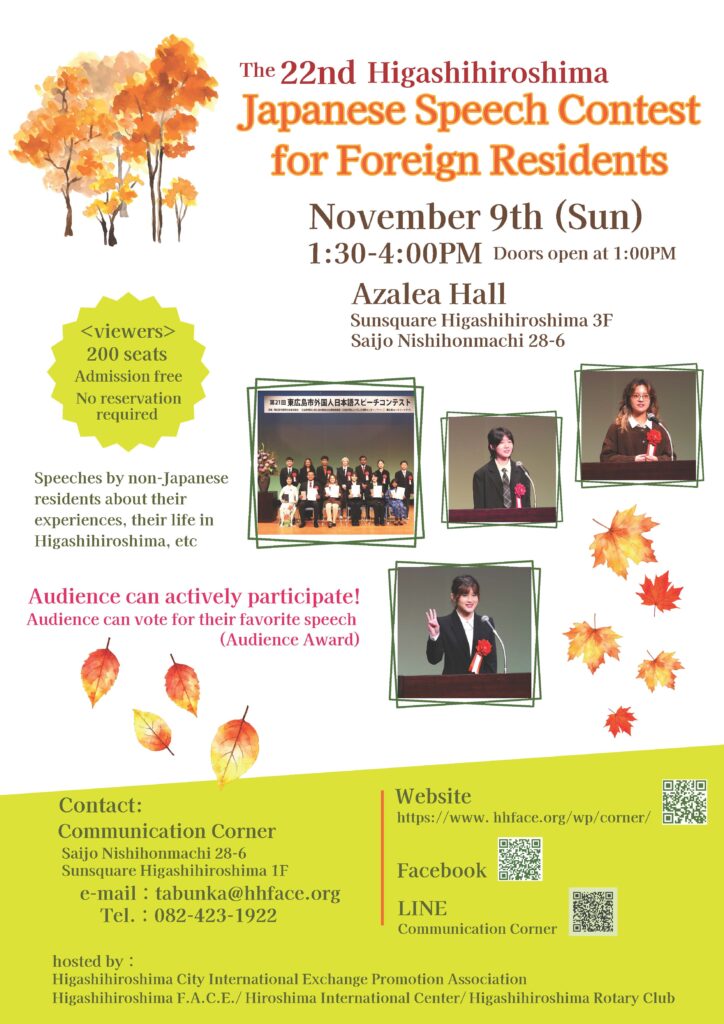 This event will take place in Azalea Hall on Sunday, November 9th. If you are a non-Japanese resident, and you live, work or study in Higashihiroshima-city, how about taking part? The application is being accepted till, October 10th. See the flyers for an overview of the contest and how to apply.