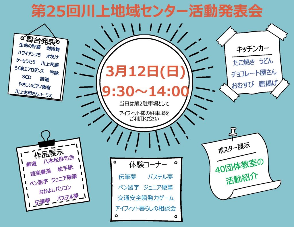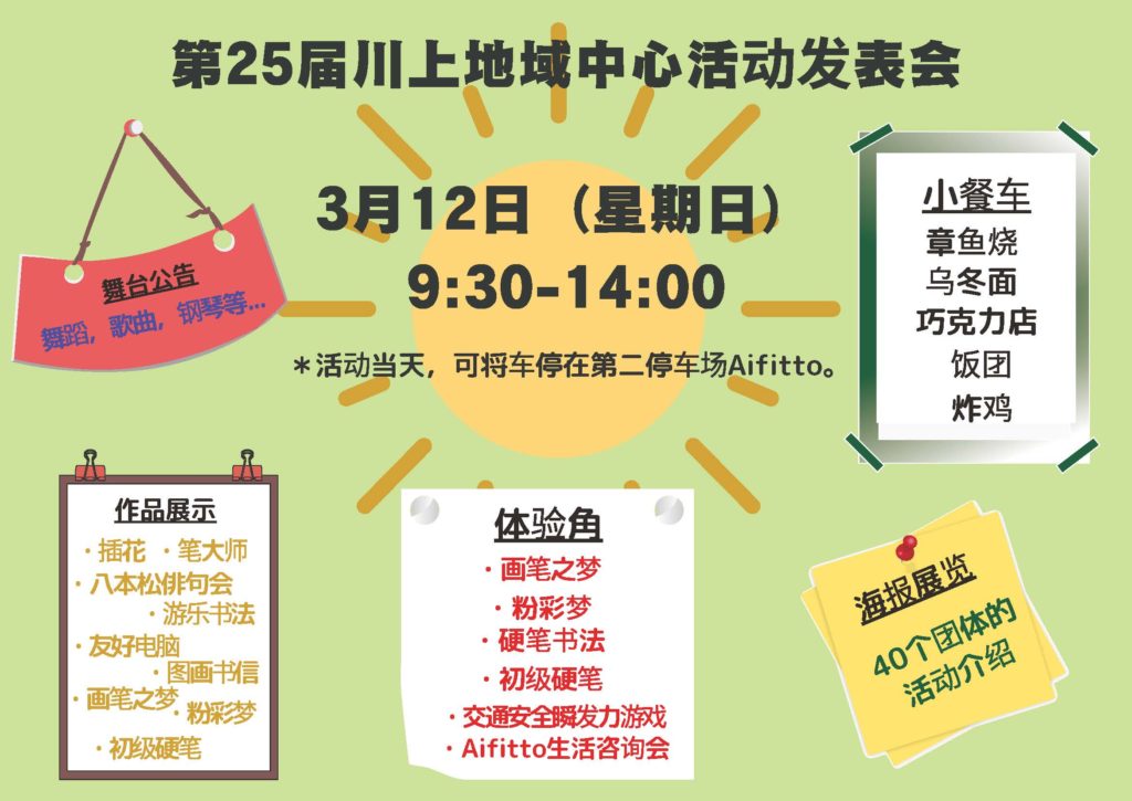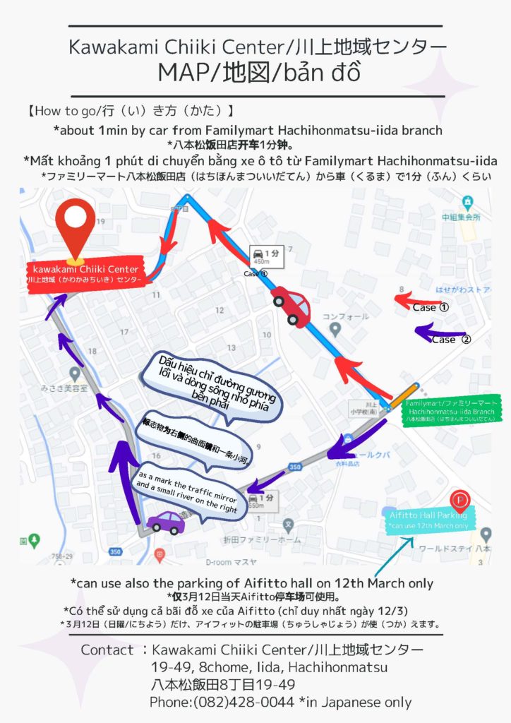 川上地域センターでは、3月12日(日曜)に活動発表会があります。この発表会に、「東広島市在住の外国人の方々も観に来て頂きたい!」ということで、多言語でチラシと地図を作らせて頂きました。これを機に、外国人の方々も気軽に川上地域センターの講座やイベントなどに参加して頂ければと思います。