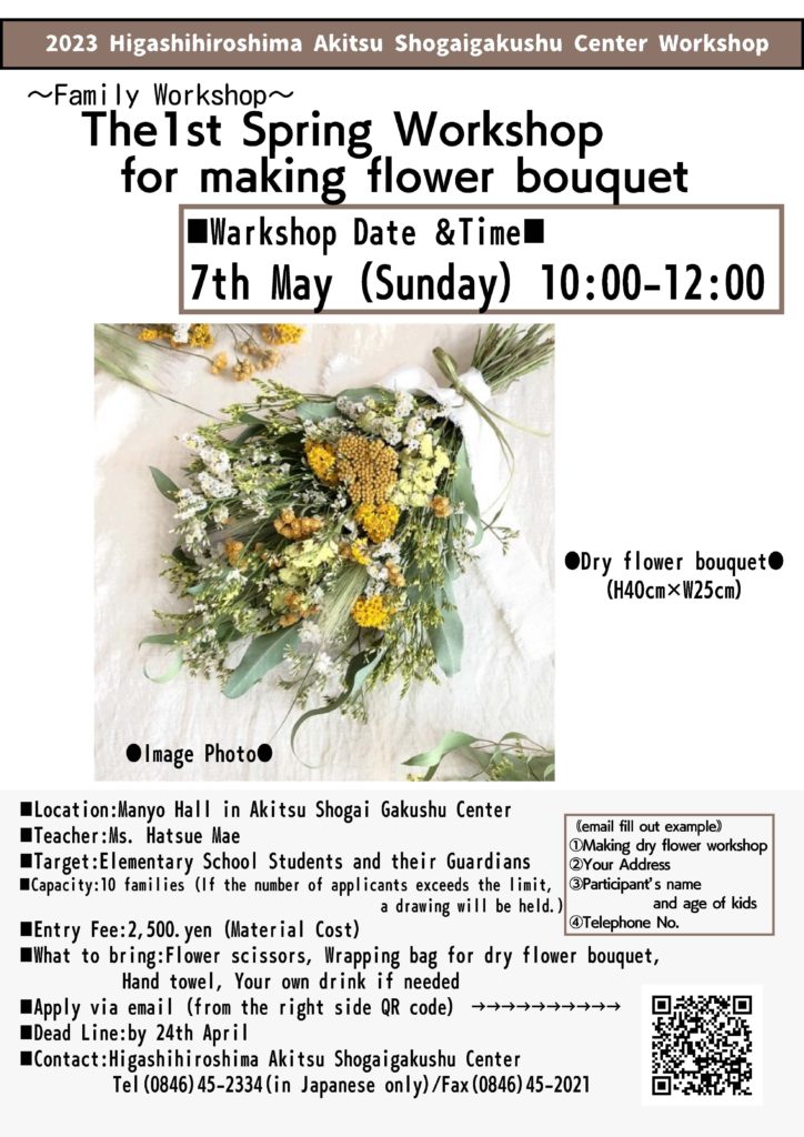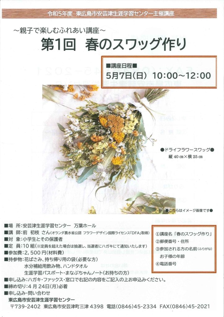 5月7日日曜日、10:00~12:00、安芸津生涯学習センターで、親子で楽しむふれあい講座「春のスワッグ作り」があります。東広島市在住の外国人親子にも参加して頂きたく、英語でチラシと安芸津生涯学習センターまでの地図を作らせて頂きました。ワークショップなので、日本語が堪能でなくても楽しめる講座です。外国人親子の皆さんの申込、ご参加をお待ちしております!