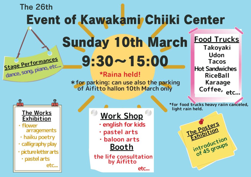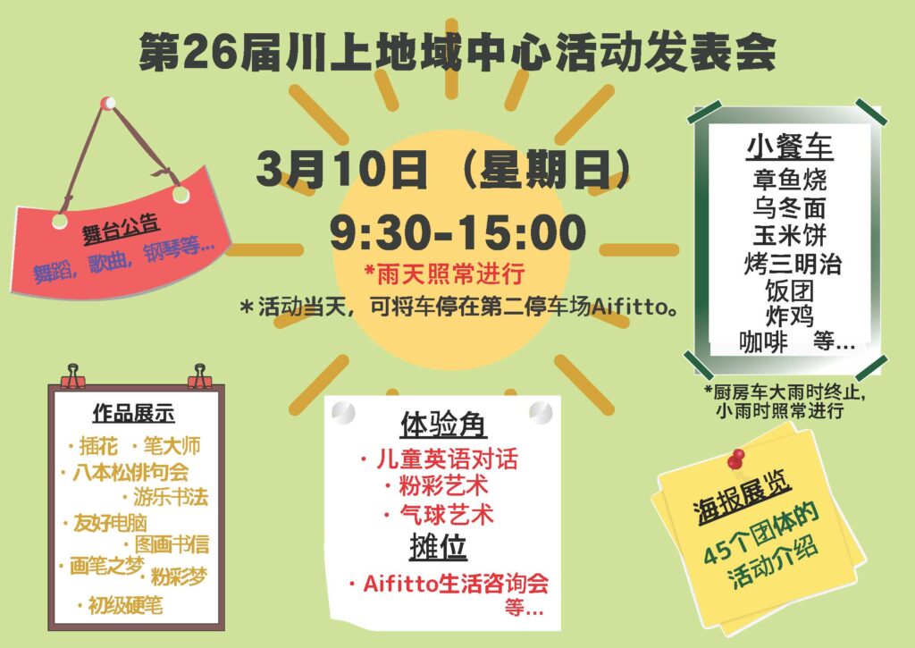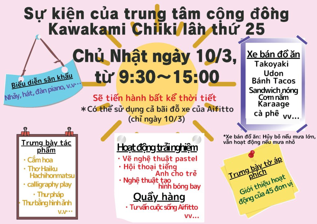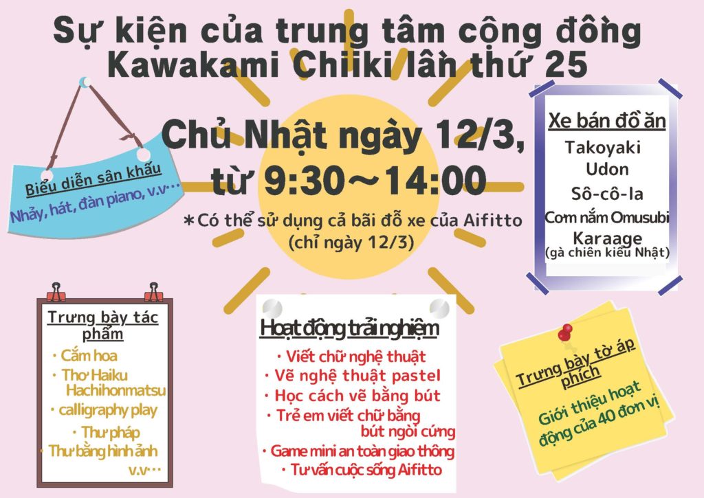 3月10日(日)10時~15時、川上地域センター活動発表会を開催します。昨年度同様、日本語チラシを基に多言語化チラシを作成させて頂きました。川上地域センターの近くにベトナム人実習生の住むアパートがある!なんて噂が…少しでも、地域在住の外国人市民の方の目に留まりますように。そして、「どんなトコかな~」なんて思って、覗いてくれますように。