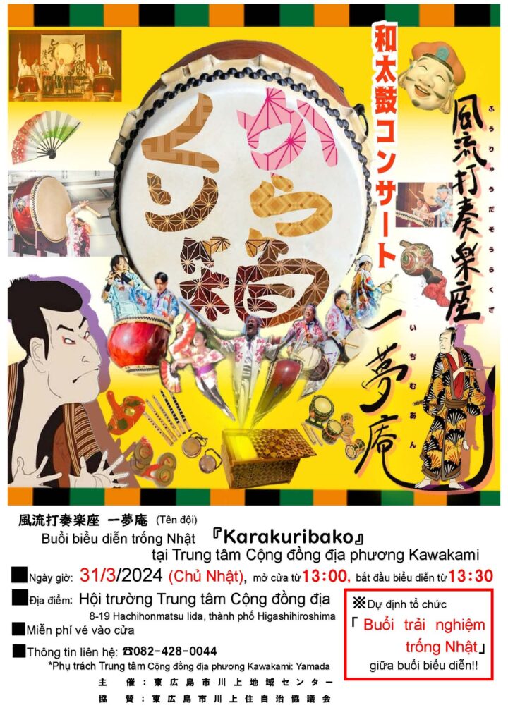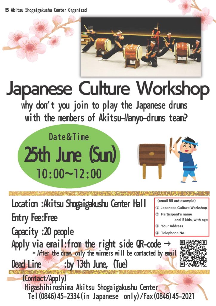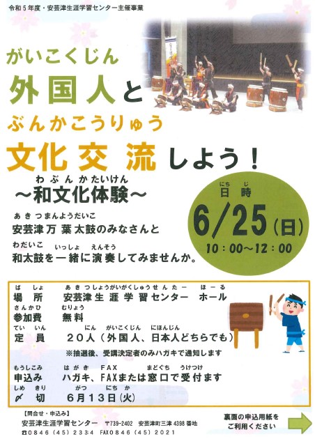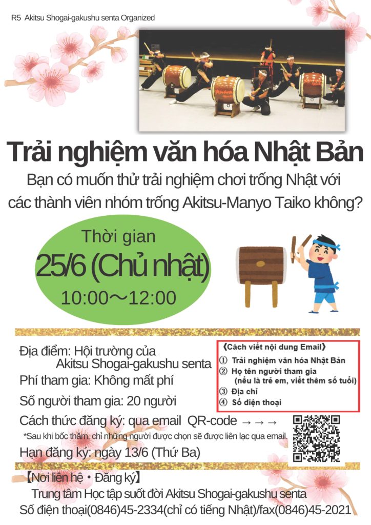 6月25日(日)10:00~12:00、安芸津生涯学習センターの「和文化体験」で、安芸津万葉太鼓の演奏が体験できます。東広島市在住の外国人の方にも参加して頂くために、英語、ベトナム語のチラシを作成しました。安芸津は、特にベトナム人技能実習生が多く住んでいるので、ベトナム語のチラシも作りました。日本人と安芸津や東広島市在住の外国人の皆さんが、楽しく安芸津万葉太鼓を通して交流ができますように。