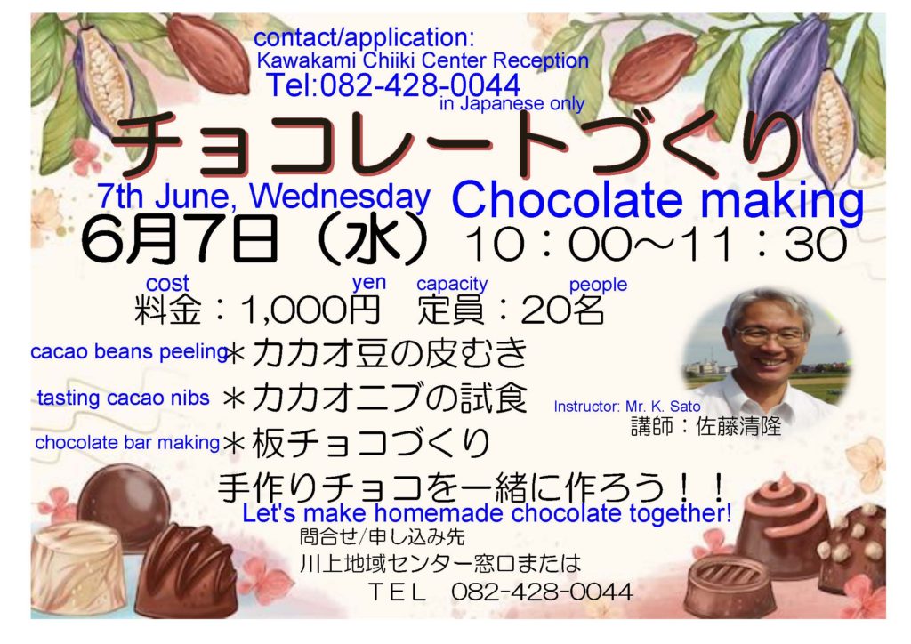6月7日(水)10:00~11:30、川上地域センターでチョコレートづくりの講座があります。日本人だけでなく、外国人の方にも参加をして頂きたく、日本語チラシに英訳を付けました。講座は日本語のみで行われますが、日本語が堪能でなくてもチョコレートづくりは参加可能です。このチラシが、少しでも多くの外国の方の目に留まりますように。