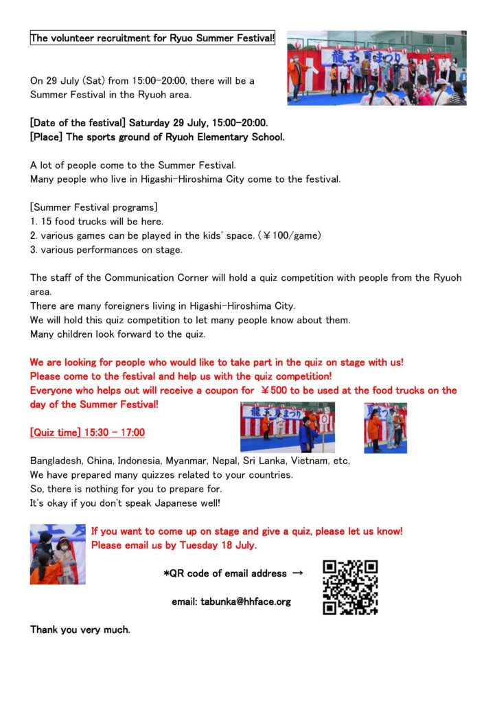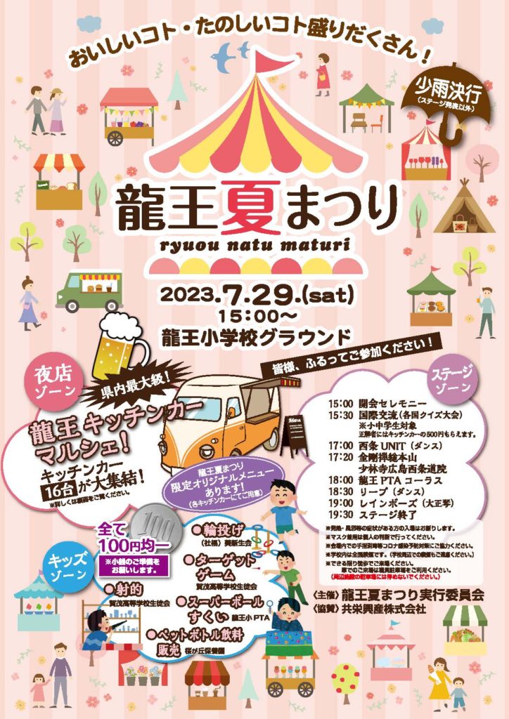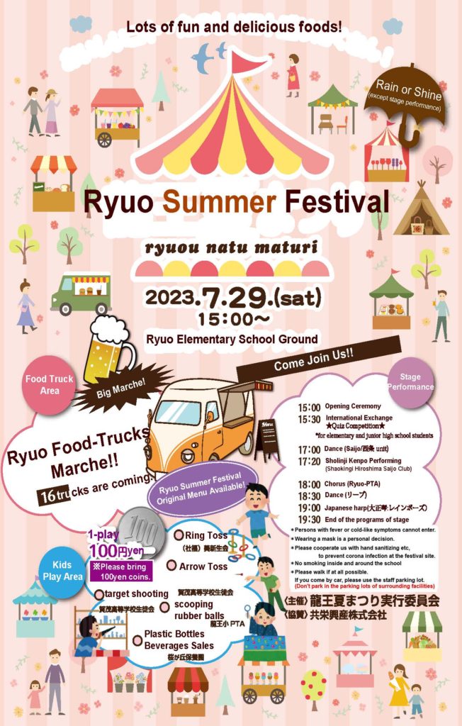 7月27日(土)15:00~、 龍王夏まつりが開催されます。いろいろなステージパフォーマンス、1ゲーム100円で遊べるゲームコーナー、16台のキッチンカーも来ます。今年は、無料で遊べる「ちびっこふわふわ迷路」もあります!外国人市民用に英語版チラシを作成しました。今年も国際交流○×クイズがあります。外国人市民のボランティアを募ります。集まってくれますように(切実)w