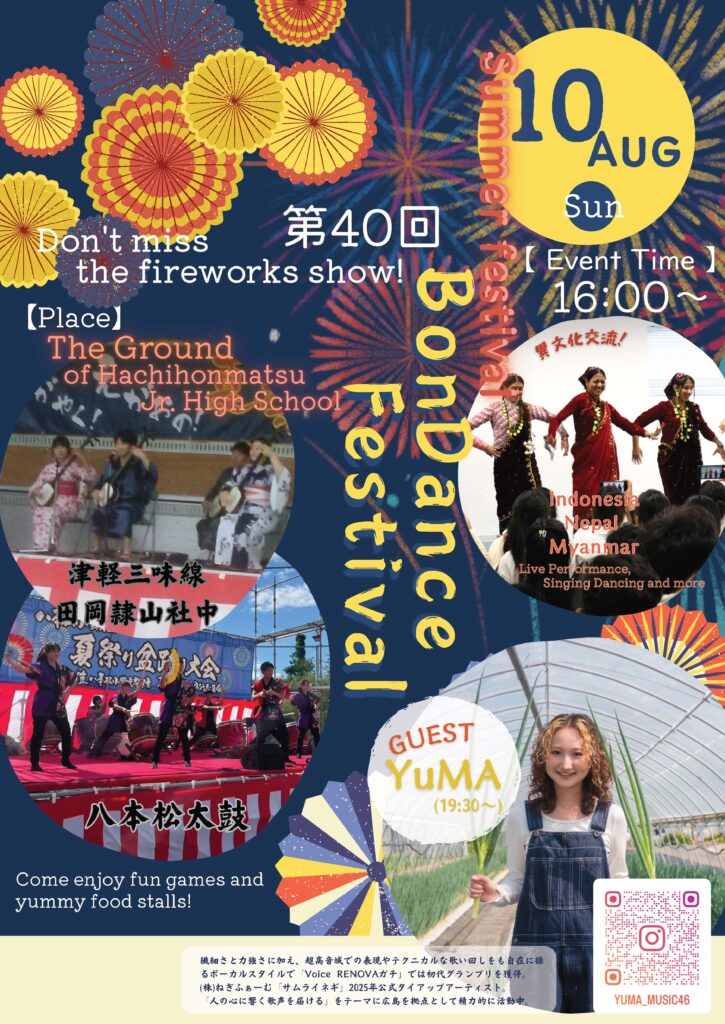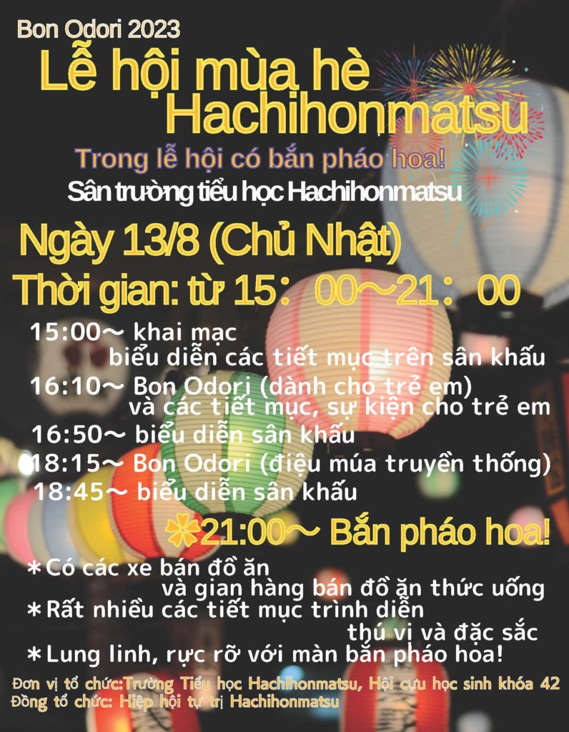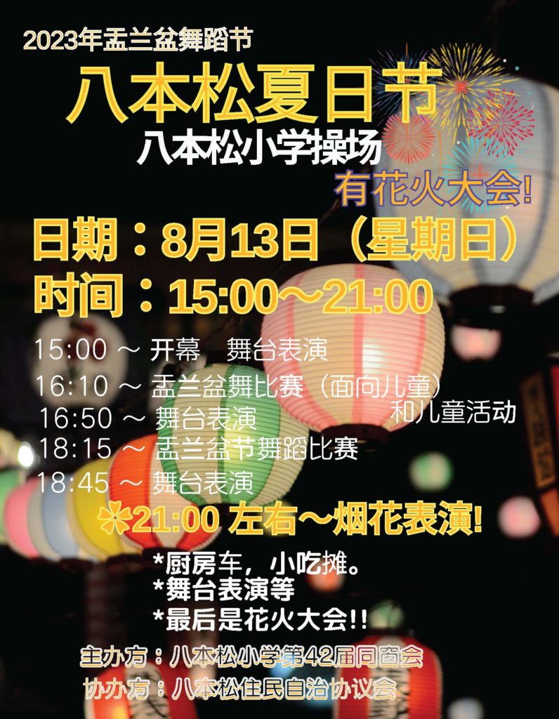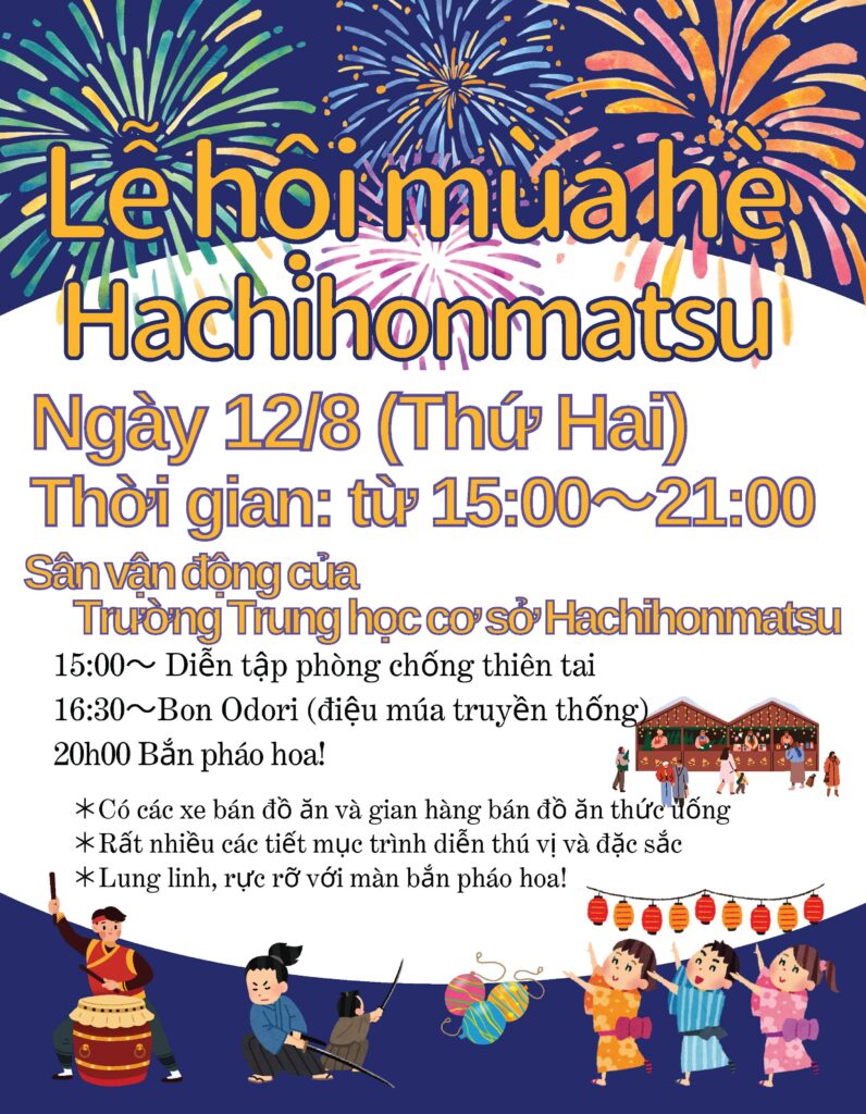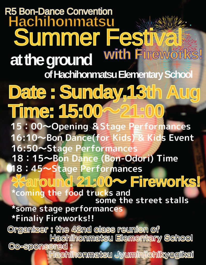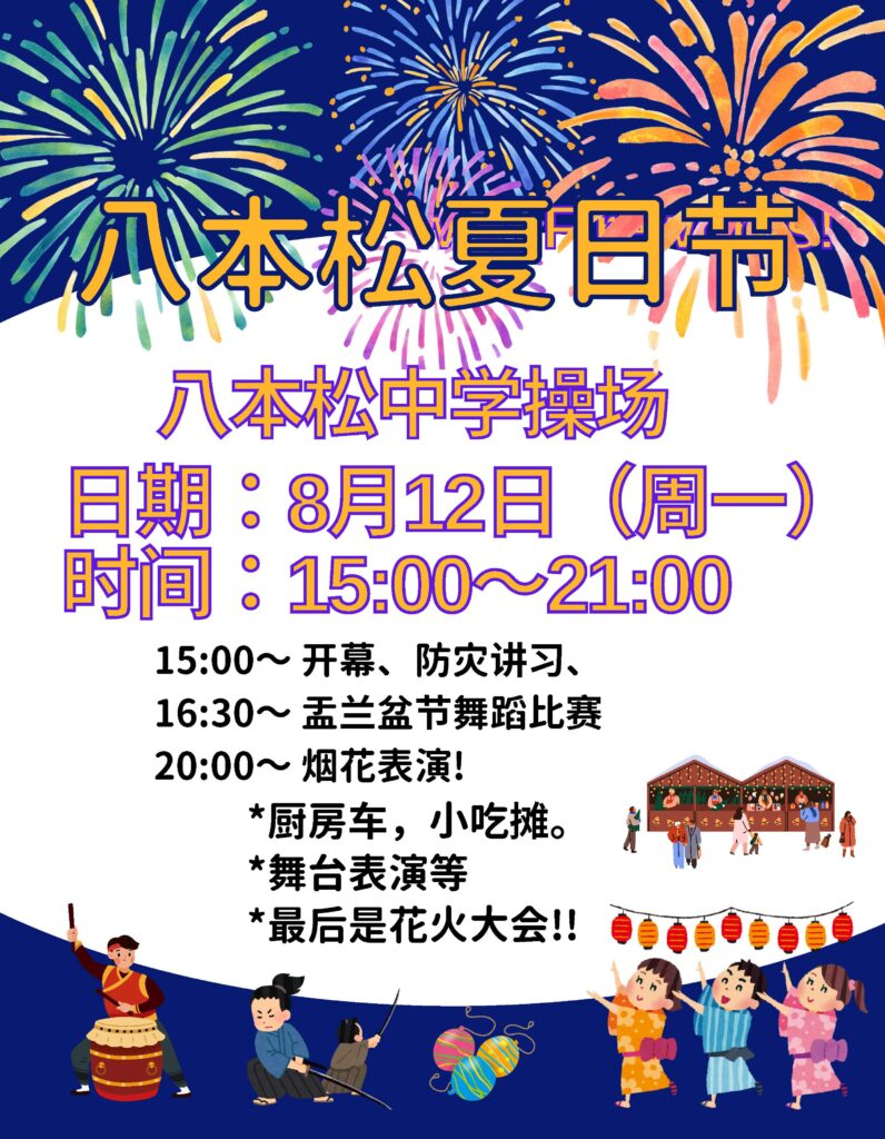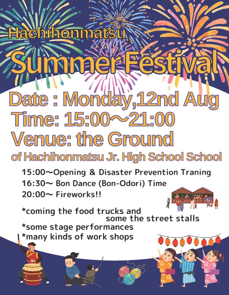 8月13日(日)、八本松小学校のグラウンドで、「八本松サマーフェスティバル」があります。外国人市民の方々にも是非参加をして頂きたく、多言語でチラシを作成しました。いろいろなステージパフォーマンス、盆踊り大会、最後は花火大会もあります。フードトラックや屋台もあります。ブラジル料理の屋台もあります。外国人市民の皆さんも一緒に楽しんで頂けますように。