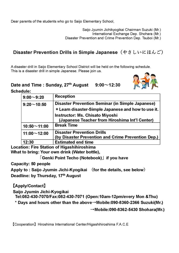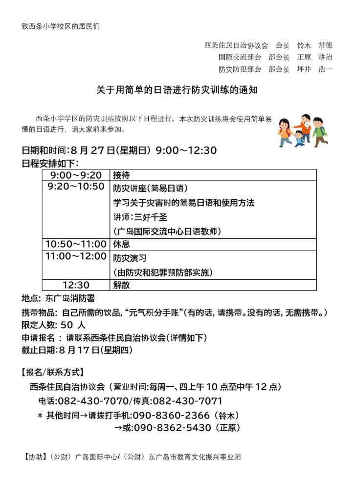 8月27日(日)、西条住民自治協議会が、防災訓練をします。西条小学校地区在住の外国人市民にも呼びかけるため、防災訓練のチラシを英語と中国語で作成しました。このチラシは、西条小学校に通う外国人児童に配られました。西条小学校に通う外国人児童は、約40人です。夏休み終了直前ですが、外国人市民の親子もたくさん参加してくれますように。