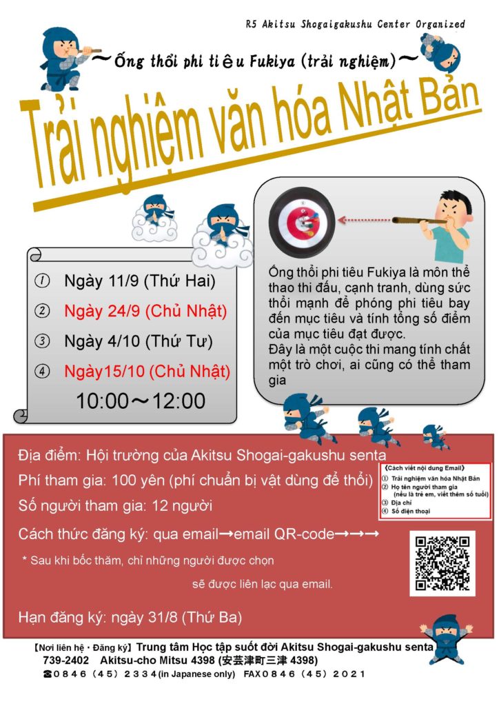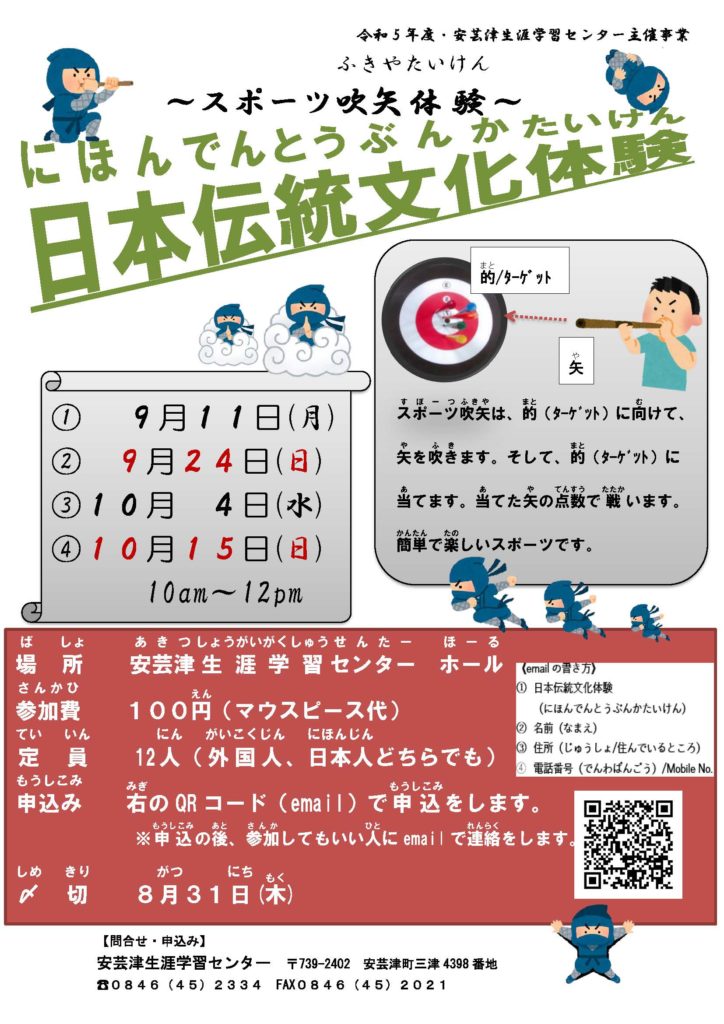 9月に2回、10月にも2回、安芸津生涯学習センターで、「スポーツ吹矢」が体験できます。外国人市民の方用に英語とベトナム語、今回は、やさしい日本語のチラシも作らせて頂きました。安芸津には、ベトナム人、フィリピン人、インドネシア人の外国人市民の方が多いようです。勿論、安芸津に住んでいなくても、外国人市民の方であれば、参加申込が出来ます。スポーツ吹矢は、腹式呼吸で健康にも良いそうです。そんなスポーツ吹矢で、健康的に交流も楽しんで頂けますように。
