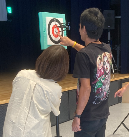 全4回(の内、参加出来る日のみの参加でOK!)で、9月24日(日)10:00~12:00、2回目のスポーツ吹矢体験が開催されました。日曜日だったので、フィリピン人8名、インドネシア人1名、アルゼンチン人1名と日本人、それぞれグループに分かれて、スポーツ吹矢を体験しました。今回は、練習で、10月の日曜日(4回目)にグループ毎でコンペティションをします~と説明後、練習を始めたら…皆上手い!ボスボス矢が的に当たること当たること当たること!!3重に矢が積み重なった人もいました(下段写真参照)!!!若さか?国民的DNAか??外国人市民、凄過ぎる、、、(汗)コンペティションでは、「優勝者に商品を出そう!」という声も上がりました。どうなるか、、、楽しみです(商品が?)笑(^^;A