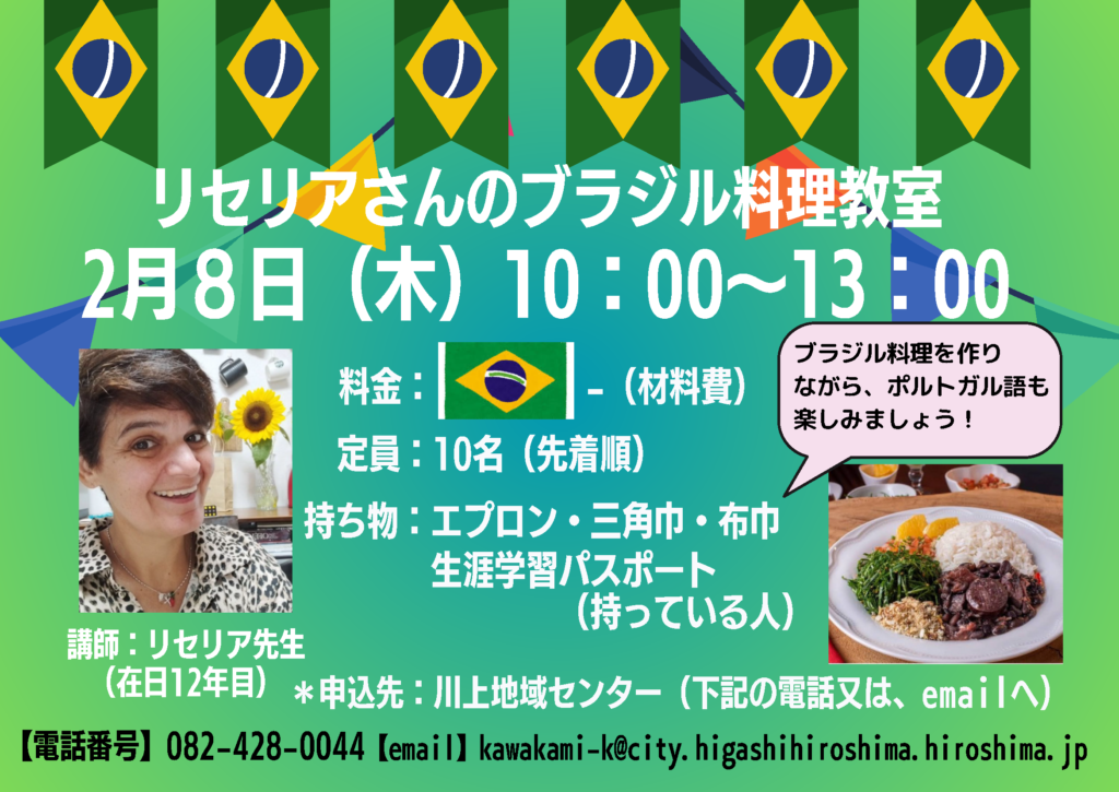 2024年、最初の地域の多文化共生は、2月8日(木)「リセリアさんのブラジル家庭料理教室」です。講師のリセリアさんは、八本松在住(まさに地域!)、在日12年目のブラジル人です。ブラジルの代表的家庭料理から、ブラジルの歴史やちょっとしたポルトガル語なども楽しんでみませんか?ブラジルでは、元小学校教員だったリセリアさん。異食文化から多方面にブラジルを楽しみましょう!申込は、1月9日(火曜)~。詳細は、川上地域センターにお問合せください。