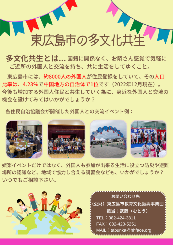多文化共生を謳わずとも、こうした日常のイベントに外国人市民の方々が参加出来る事を心掛けたいと思います。外国人市民の方々が興味を持てそうな地域のイベントや講座を検索し、許可を頂ければチラシを多言語化して、情報発信させて頂きたいと思います。